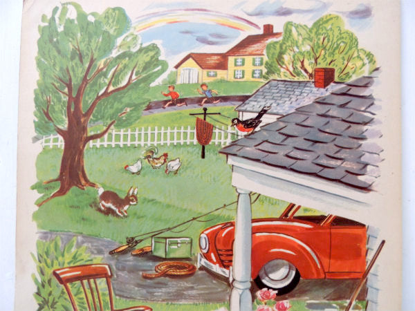 クラシックカーや子供のロッキングチェア・クーラーボックス・バスケットなど、アメリカの昔のお庭の様子が描かれております。