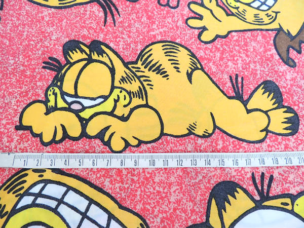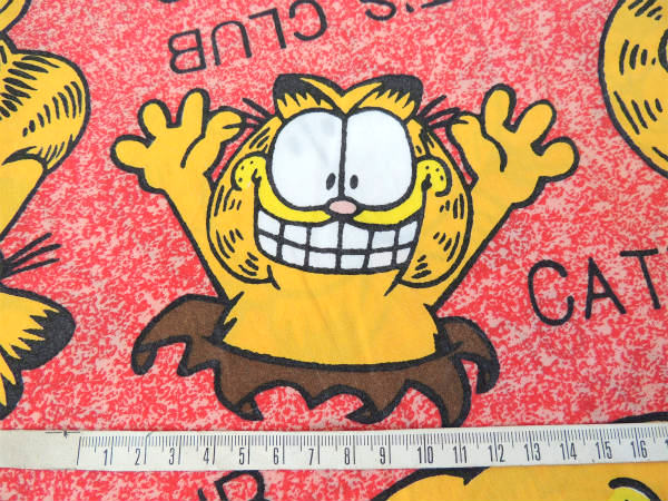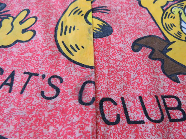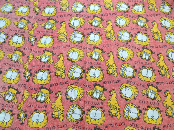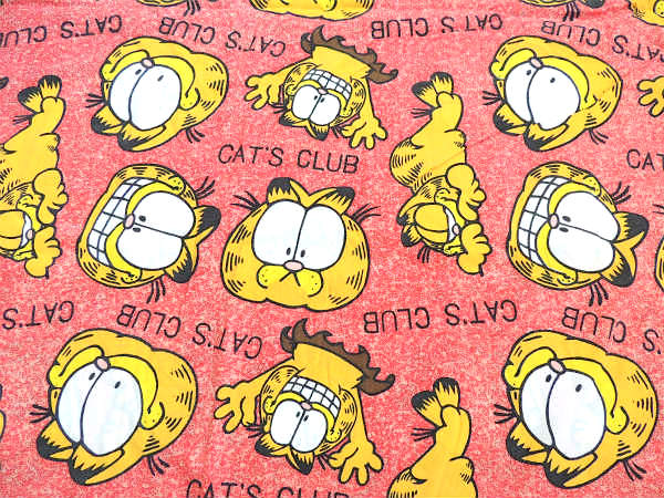 赤色の霜降り柄ベースに、色々な表情をしたガーフィールド&“CAT'S CLUB”の文字の、カラフルな総柄プリントです。