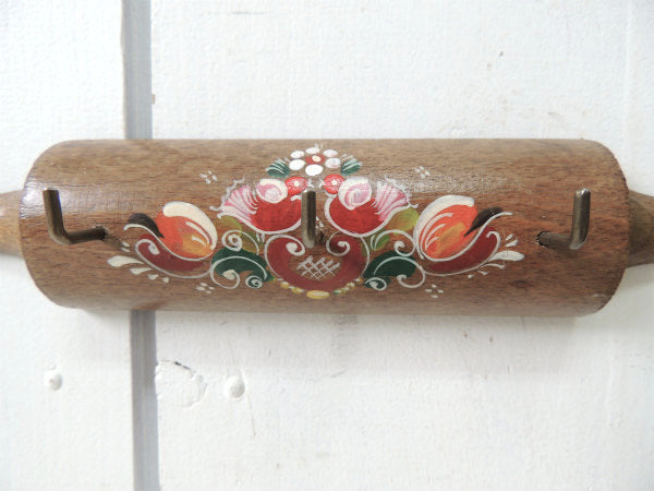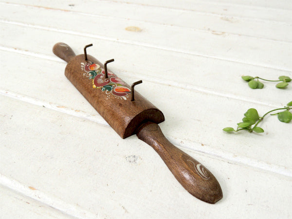 ハンドペイントの花&鳥柄・ローリングピン形・木製・アンティーク・フック/壁掛けフック