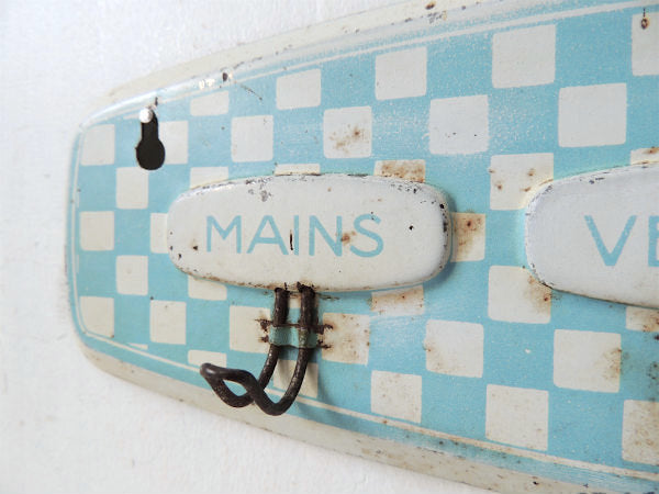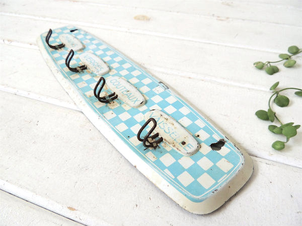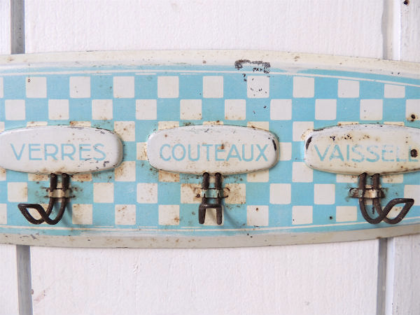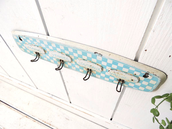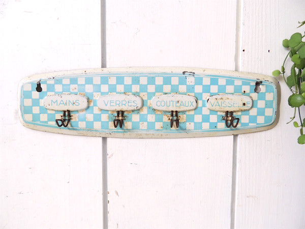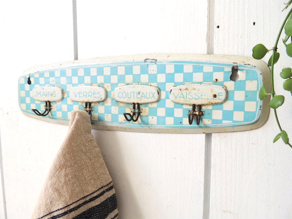 フランス・パリで見つけました・・爽やかなチェッカー柄のアンティーク・キッチンクロス用・4連フックです。