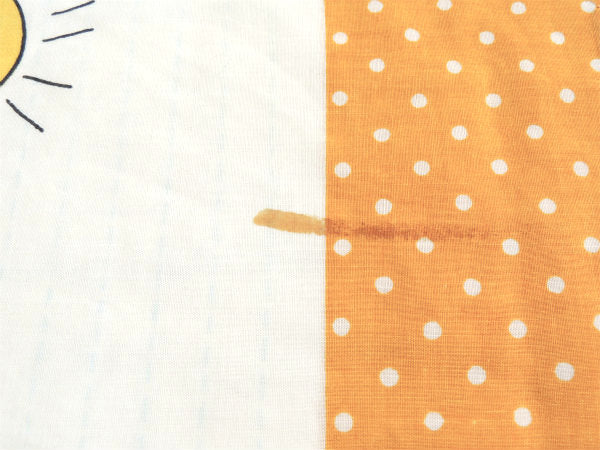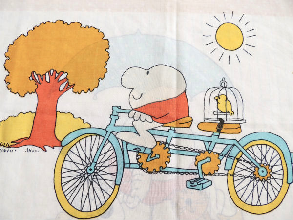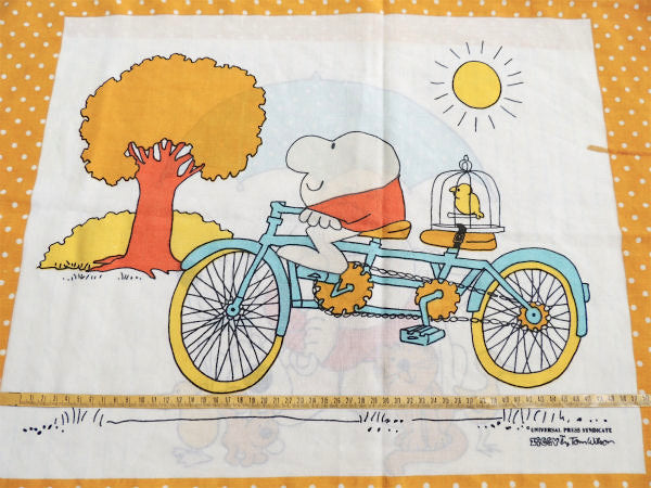 アメリカで見つけました・・アメリカンコミックの愛嬌ある人気キャラクター『ジギー(ZIGGY)』のヴィンテージ・ピロケース(枕カバー)です。 太陽の下で自転車に乗っているジギーと、雨の中で傘をさしているジギーの、とっても可愛い両面プリントです。 シワのよりずらいノンアイロン素材です。 ピロケースとしてはもちろん、子供服リメイクや小物・バッグなどのハンドメイドに・・♪ MADE IN U.S.A. プリントの発色良く、生地もしっかりしておりますが、2箇所程に小さなイタミ・1箇所にペン跡等ございます(画像参照)。 日本国内にてお洗濯済みです。 画像(写真)でのご判断を宜しくお願い致します。 ■SIZE :約 W79cm×H50cm ■コンディション : ★★★★☆ ■レターパックライト¥360対応可(追跡サービスあり・補償なし) ※ご注文の際、お手数ですがメッセージ欄に『レターパックライト希望』とご記入下さい。新たにお見積もりをメールにてお知らせさせていただきます。