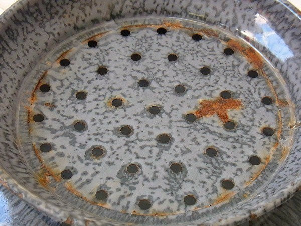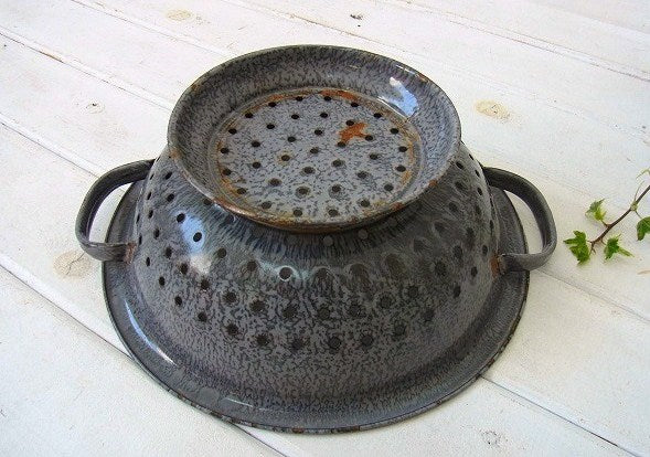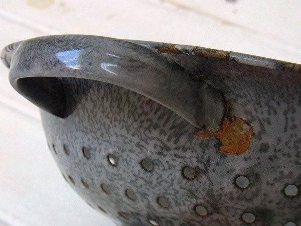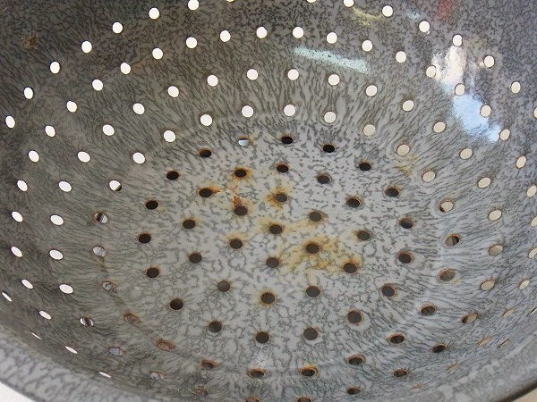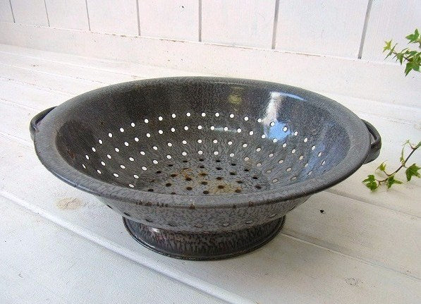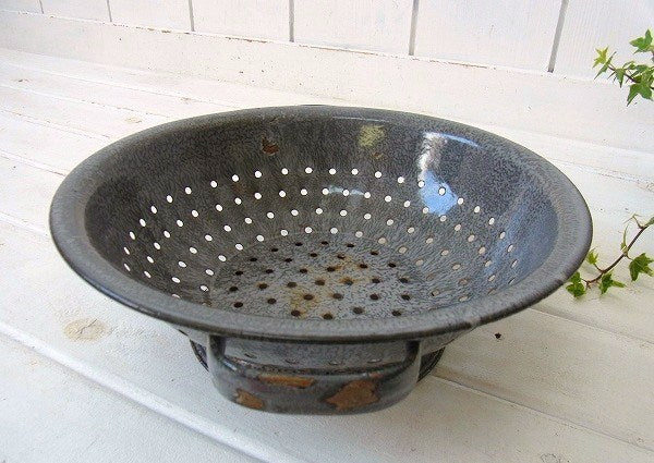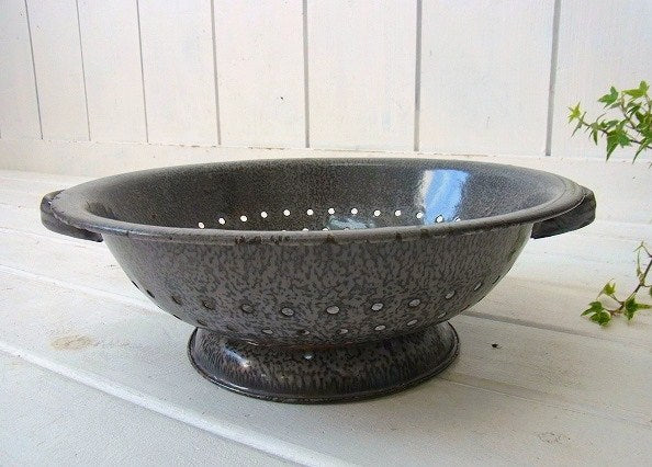 アメリカで見つけました・・ホーロー(エナメル)製の脚付き・アンティーク・コランダー(水切りボウル)です。