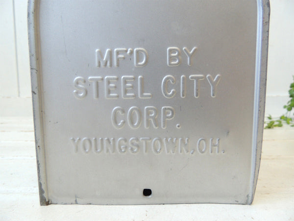 取っ手下に【U.S MAIL APPROVED BY THE POSTMASTER GENERAL】、背面に【MF'D. BY STEEL CITY CORP. YOUNGSTOWN, OH.】とエンボス英文字が入っております。