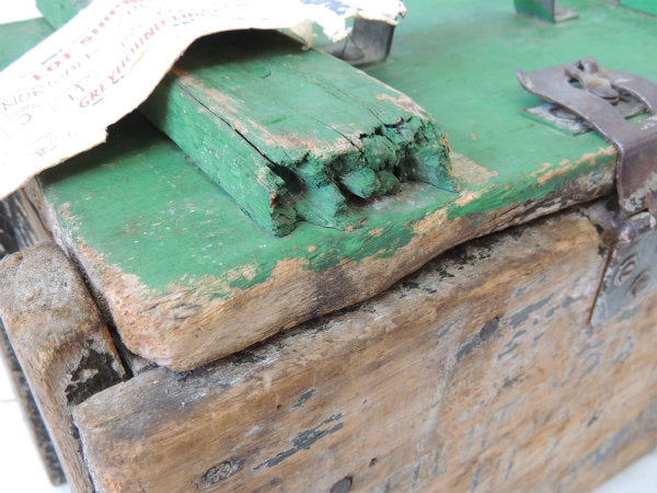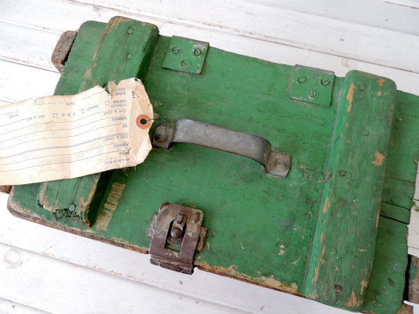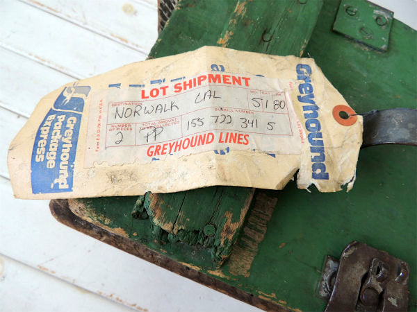 グレイハウンド・バス荷札付き グリーン色・ヴィンテージ・木製トランク 木箱 工具箱 USA