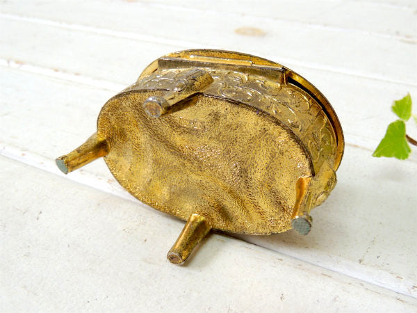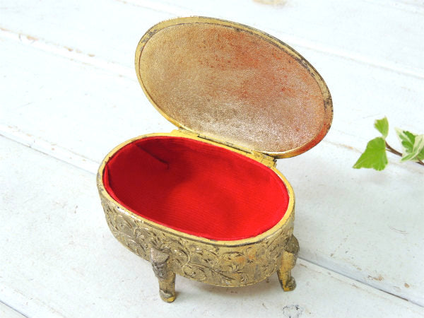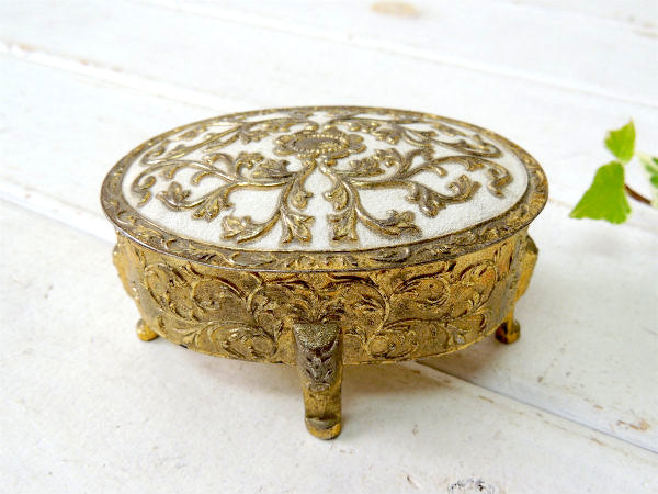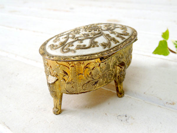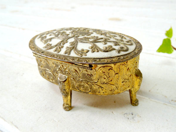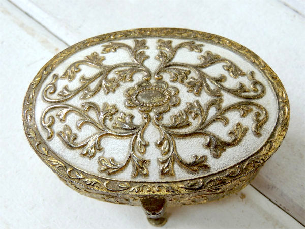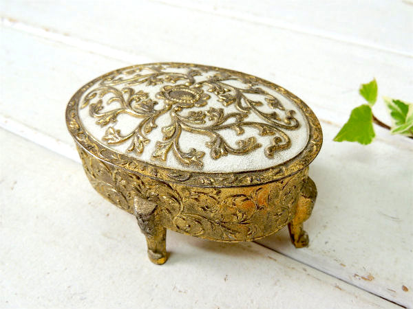 アメリカで見つけました・・脚付きゴールド色×ホワイトのメタル製・アンティーク・ジュエリーボックスです。