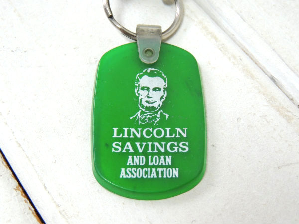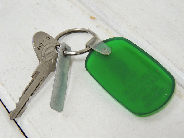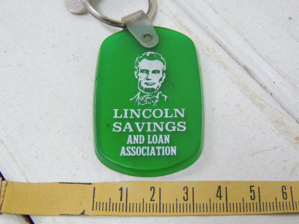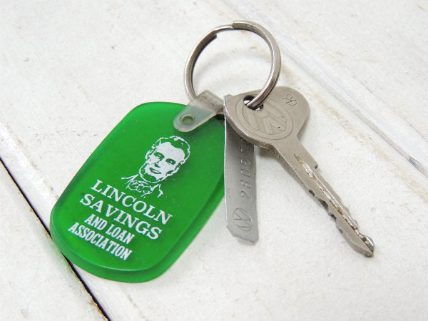 カリフォルニアで見つけました・・古いフォルクスワーゲン・キー鍵1本とちいさなVWアルミプレート付き・ヴィンテージ・グリーンカラーの”LINCOLN SAVINGS AND LOAN ASSOCIATION(リンカーン貯蓄貸付組合)”キーホルダーです。