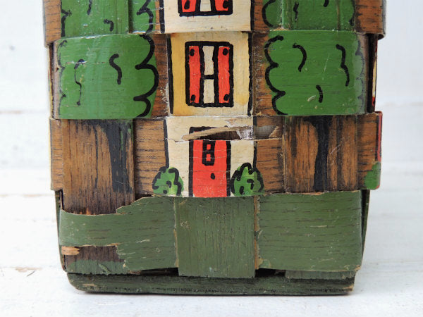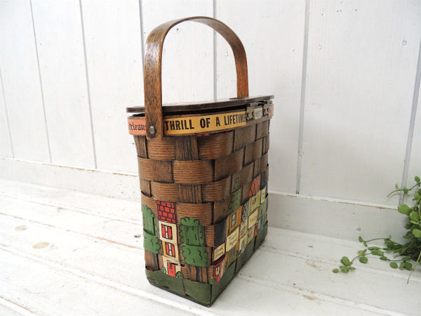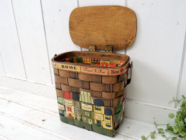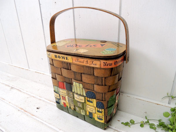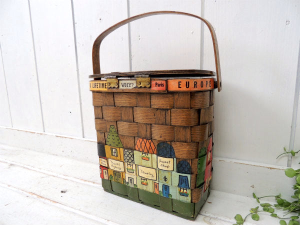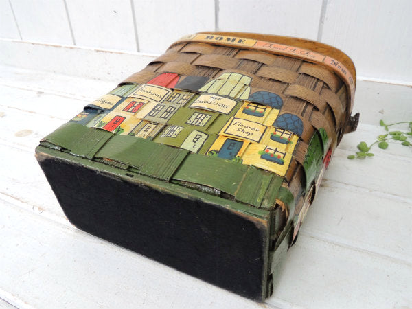 アメリカでも人気の高いコレクターアイテムで、カラフルな可愛い町並みがハンドペイントで描かれた、木製バスケットです。