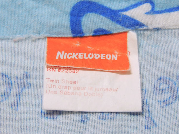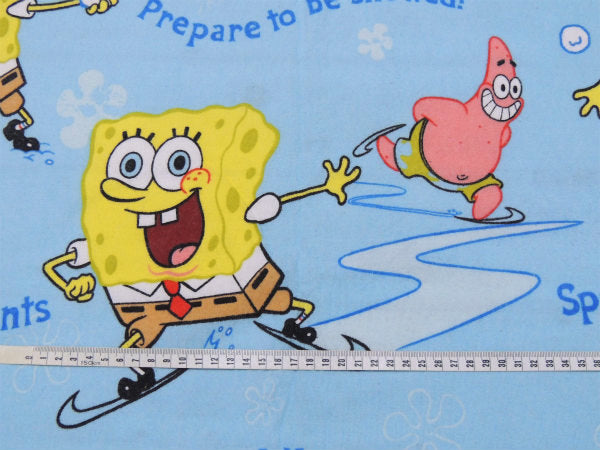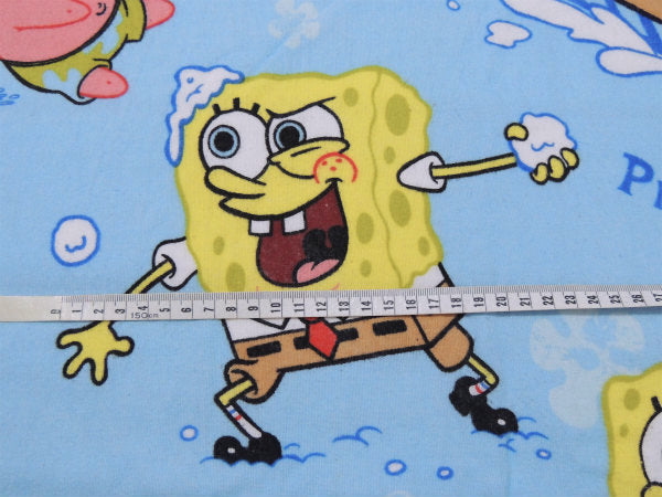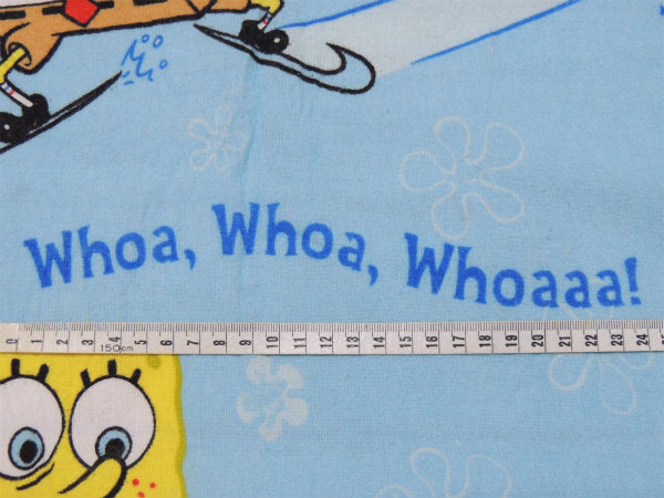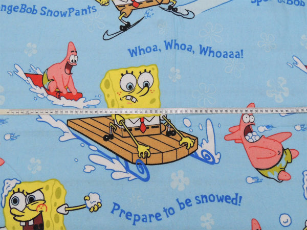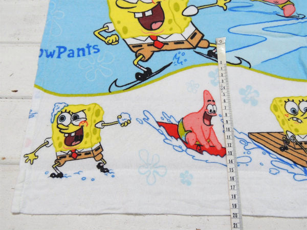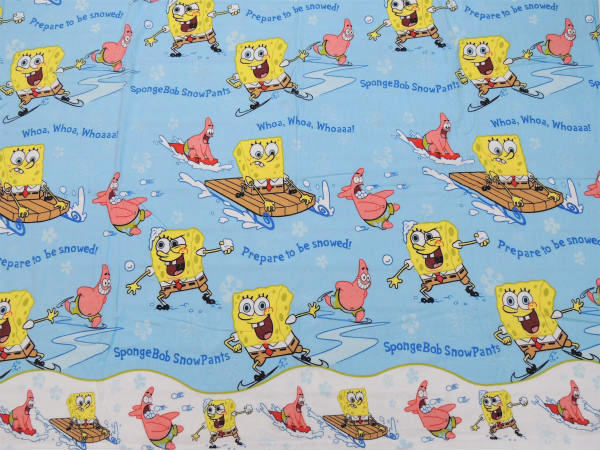 アメリカで見つけました・・・アメリカの人気テレビアニメ『スポンジボブ』の雪遊び柄・USEDフラットシーツです(ツインサイズ)。