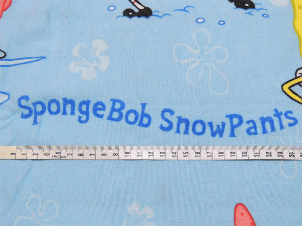 水色ベースに、スポンジボブとパトリックが、雪ソリやアイススケート・雪投げなどを楽しんでいる、カラフルな総柄プリントです。