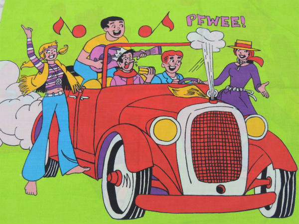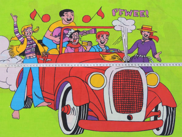 黄緑色ベースに、クラシックカーに乗ったアーチーズのロックバンドメンバーなどのカラフル&レトロな両面プリントです。