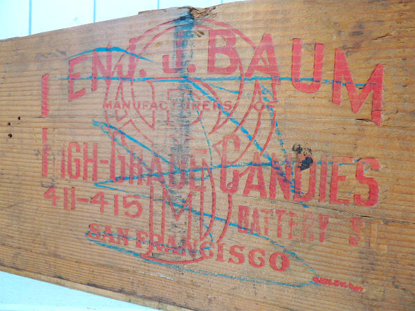 両面に【BENJ. J. BAUM MANUFACTURERS OF HIGH-GRAND CANDIES 411-415 BATTERY ST. SAN FRANCISCO】の赤色の英文字、片方サイドに紙ラベルが付いています。