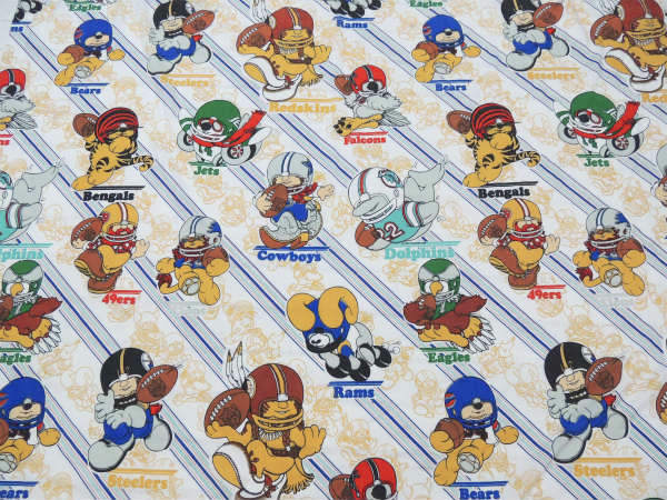 “Dolphins”・“49ers”・“BILLS”・“REDSKINS”・“LIONS”・“Cowboys”・“Eagles”・“Bears”・“Steelers”・“Bengals”・“Jets”・“RamS”など、たくさんのチームのユニフォームを着たマスコットの総柄プリントです。
