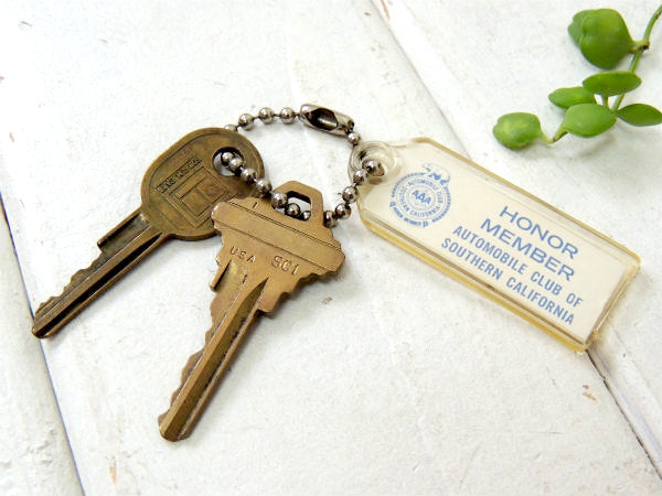 アメリカで西海岸で見つけてきました! "AAA・トリプルエー"AUTOMOBILE CLUB・デッドストック・ヴィンテージ プラスチック製 キーホルダー(ノベルティ)+真鍮製の鍵 2本付き(GM CARS&USA) ボールチェーン付き(BALL CHAIN MT.VERNON.NY.)