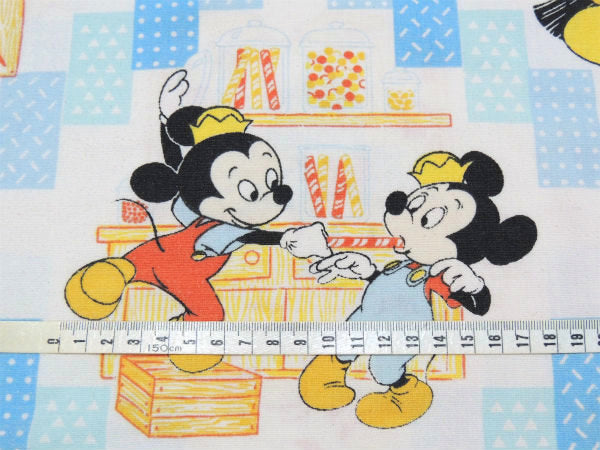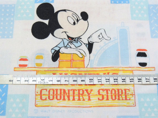 ミッキーのお店“MICKEY'S COUNTRY STORE”で、ミッキーがレジを打ったり、ミニーちゃんはお洋服の仕立て屋さん、キャンディーコーナーで遊ぶミッキーの甥モーティー&フェルディー、椅子に腰掛けリンゴを頬張るグーフィーなど、カントリーの雰囲気たっぷりの可愛いプリントです。