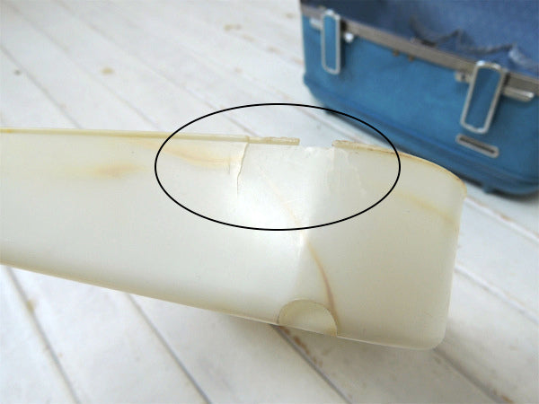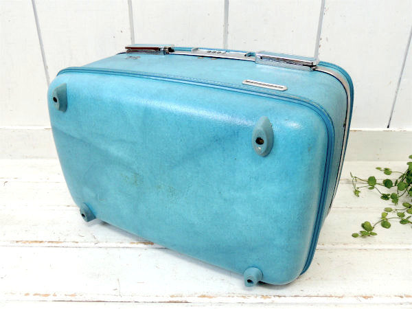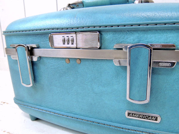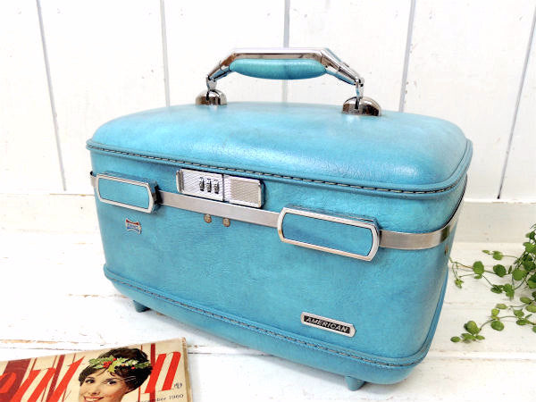 アメリカで見つけました・・・1933年にアメリカ合衆国ロードアイランド州で誕生した、アメリカでは誰もが知っている旅行かばんブランド『American Tourister(アメリカン・ツーリスター)』のダイアルロック付き・水色・2段式・ヴィンテージ・メイクボックスです。