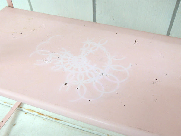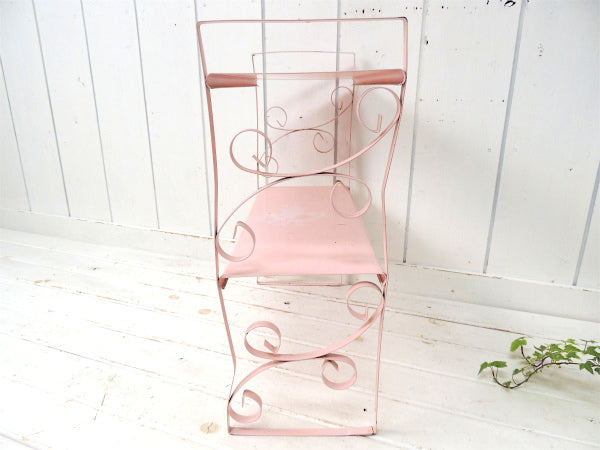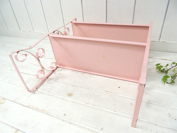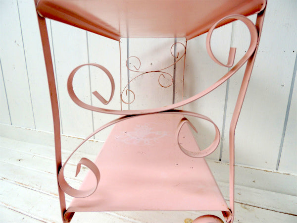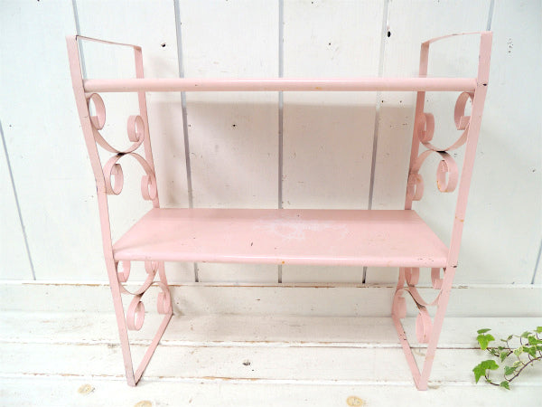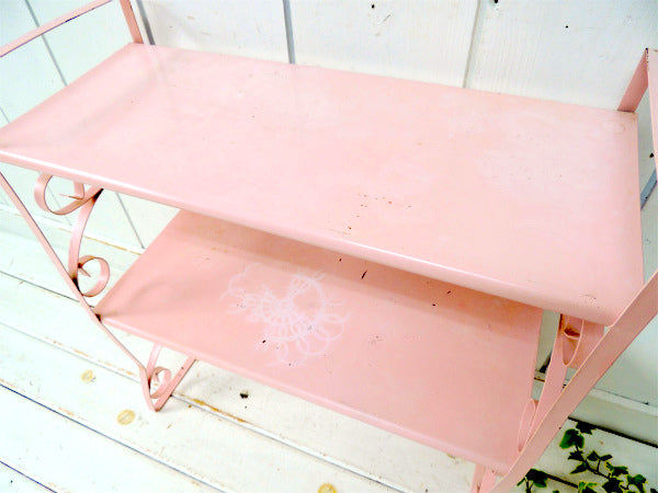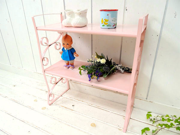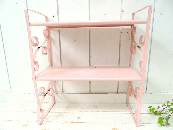 アメリカで見つけました・・ベビーピンク色のメタル製・脚付きアンティーク・2段シェルフ(飾り棚)です。