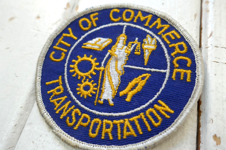 アメリカ西海岸・カリフォルニア Los Angelesで見つけました・・CITY OF COMMERCE TRANSPORTATION カリフォルニア コマース 市役所 交通機関 バス・ヴィンテージ・ワッペン(刺繍 ワッペン)です。