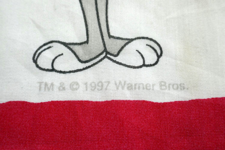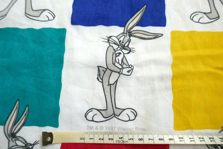 アメリカ西海岸・カリフォルニア州・ロサンゼルス郊外で見つけました・・ワーナーブラザーズを代表するアニメ『ルーニーテューンズ』の人気キャラクター・バッグスバニーのUSEDフィットシーツです(ツインサイズ) 。