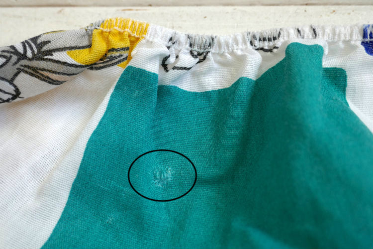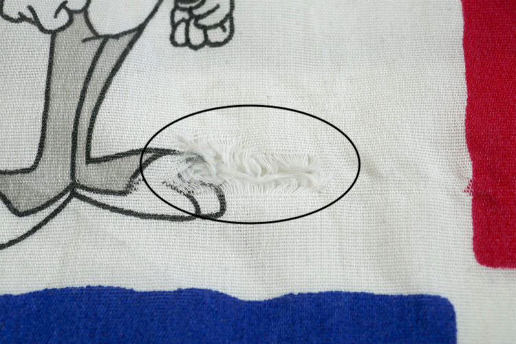 プリントの発色良く生地もしっかりしていますが、1〜2数カ所に小さなヤブレ箇所等ございます。