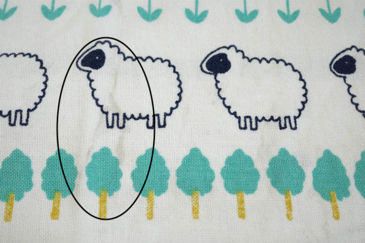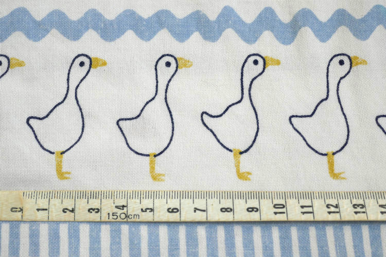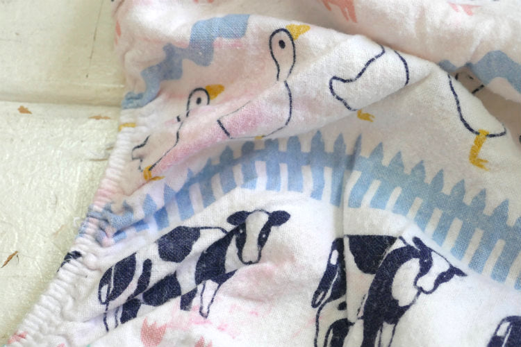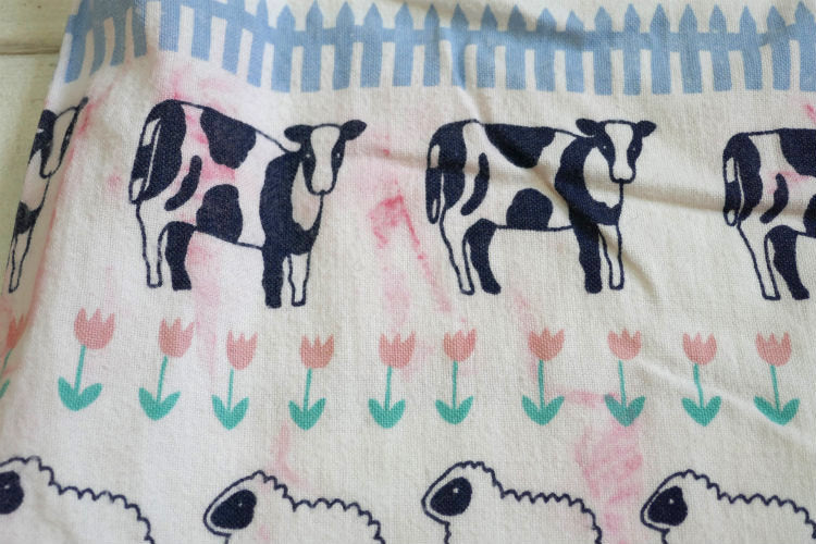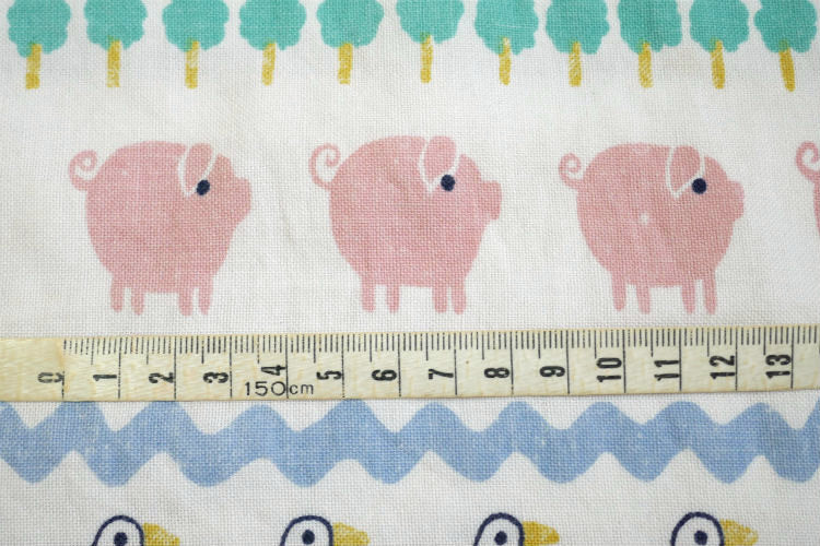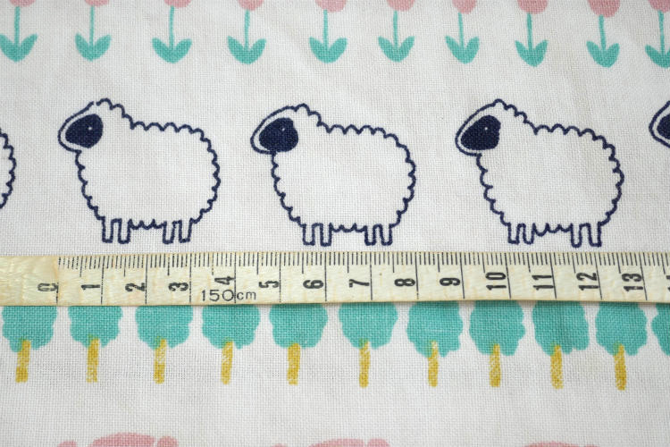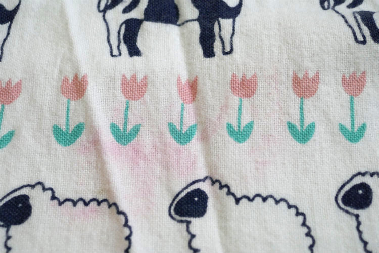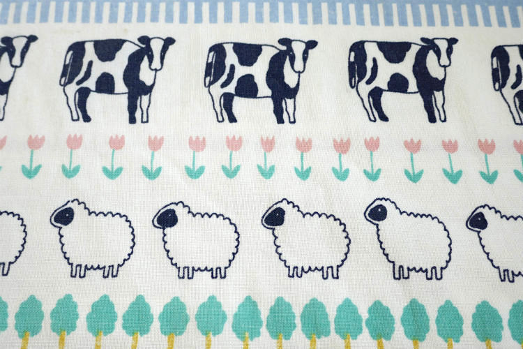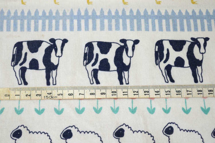 ホワイトベースに、牛・羊・ブタ・アヒル・チューリップ・木・柵が列になった、ほのぼのとした可愛いプリントです。