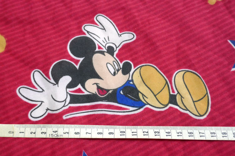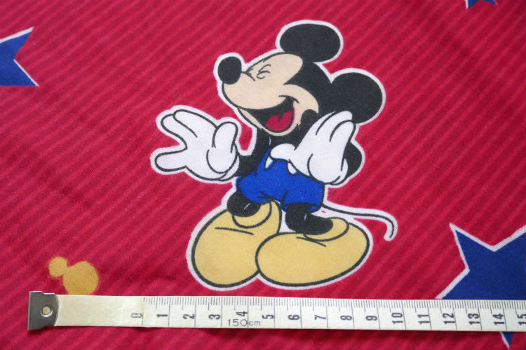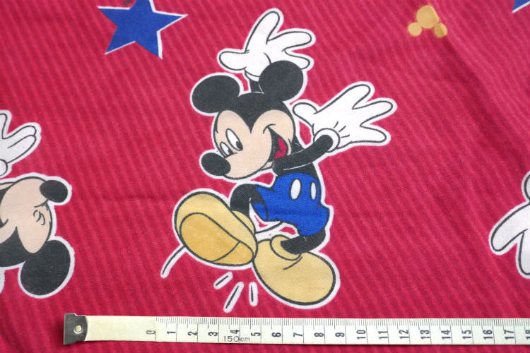 赤色のストライプ柄ベースに、色々なポーズをとったミッキーマウスの総柄プリントです。