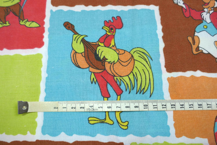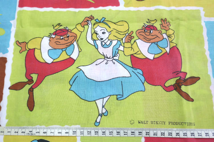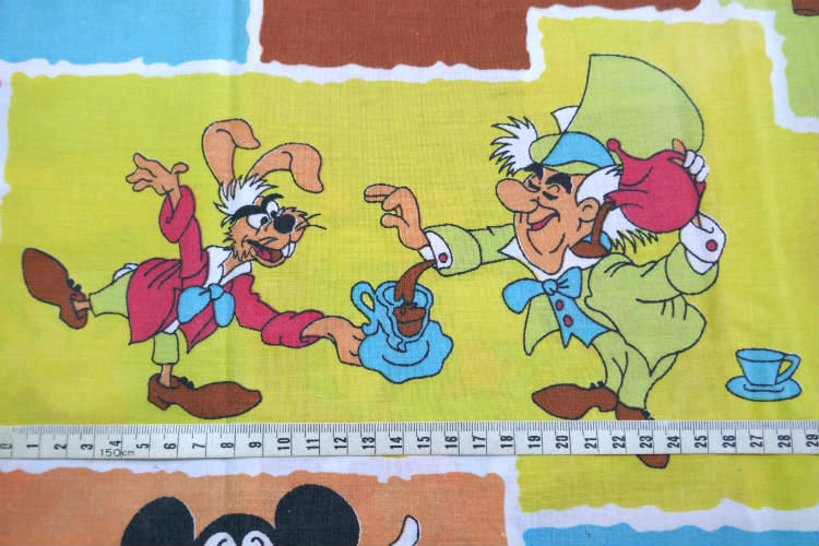 カラフルなパッチワーク柄に、ディズニーの人気アニメ映画より、 ミッキー&フレンズ(ミッキーマウス・ミニーマウス・ドナルドダック・デイジーダック・プルート・ヒューイ・デューイ・ルーイ)、Bambi(バンビ・ミスバニー・フラワー)、ふしぎの国のアリス(アリス・白うさぎ・チェシャ猫・マッドハッター・トゥイードルダムとトゥイードルディー)、ロビンフッド(ロビンフット・リトルジョン・タック神父)などの、レトロ可愛い総柄プリントです。