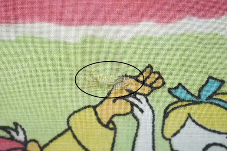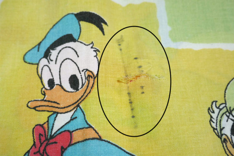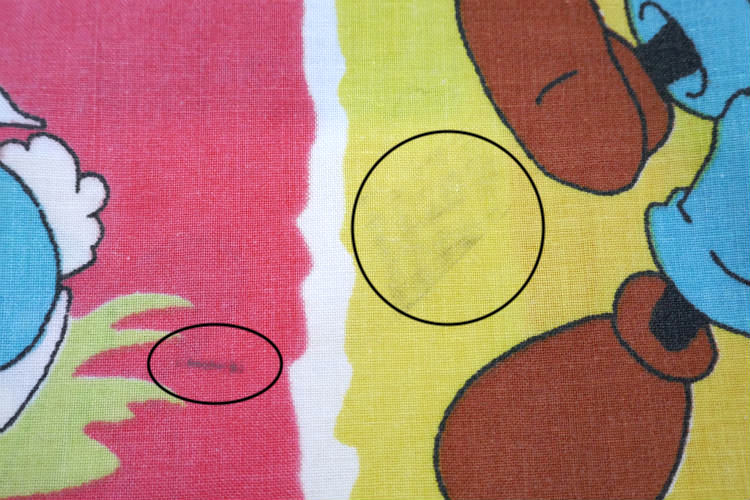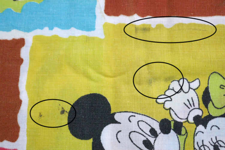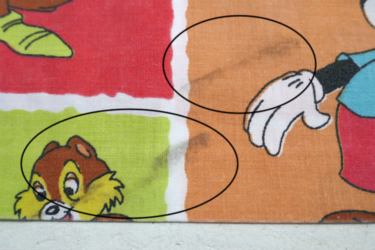 プリントの発色良く、生地もしっかりしておりますが、数カ所にヨゴレ・2箇所に約3㎝&約1㎝程のヤブレ・左上部に色抜け箇所等ございます。