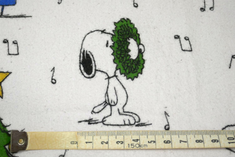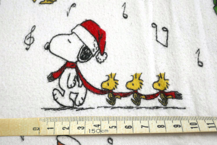 ホワイトベースに、スヌーピーやウッドストック・チャーリーブラウン・シュローダー・ルーシー・サリー・ペパーミントパティなど、ピーナッツの仲間たち大集合、クリスマスキャロルが流れてきそうな音符&可愛いクリスマス柄プリントです。