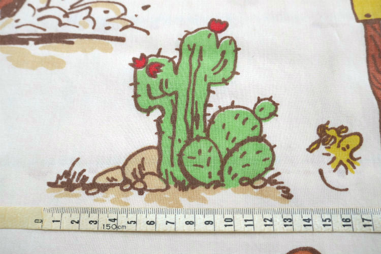スヌーピーと兄のスパイク・妹のベル・ウッドストックがキャンプを楽しんでいたり、ロデオを楽しんでいるカウボーイ姿のスヌーピー、ウエスタンハットをかぶったチャーリーブラウン・ライナス・ペパーミントパティなど、5パターンのレトロ可愛いウエスタン・カウボーイ柄プリントです。