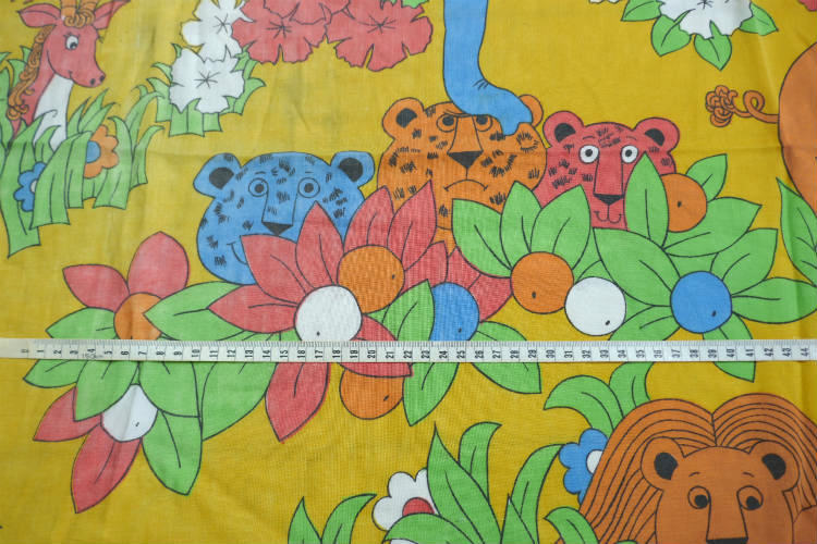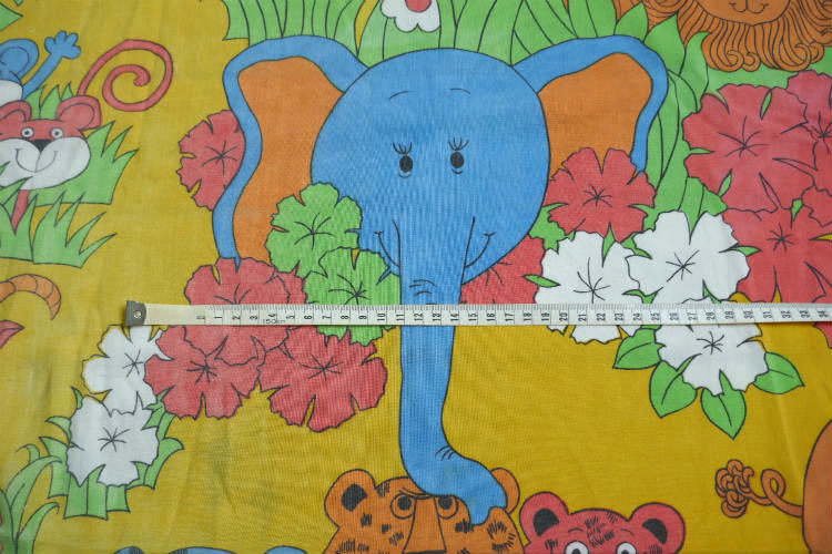 イエローカラーベースに、ゾウやキリン・ライオン・トラ・サル・シマウマ・カバなどの動物、お花やヤシの木などの、カラフルな総柄プリントです。
