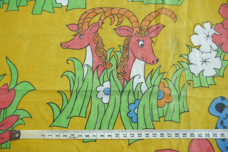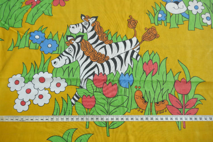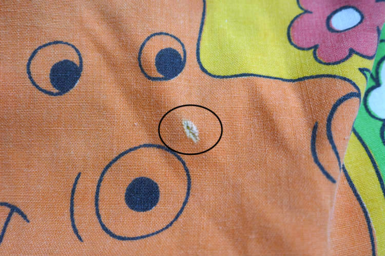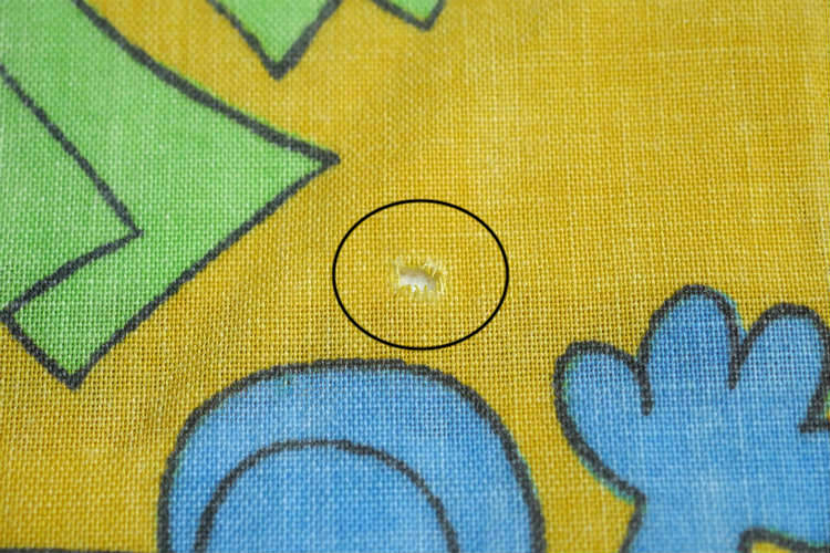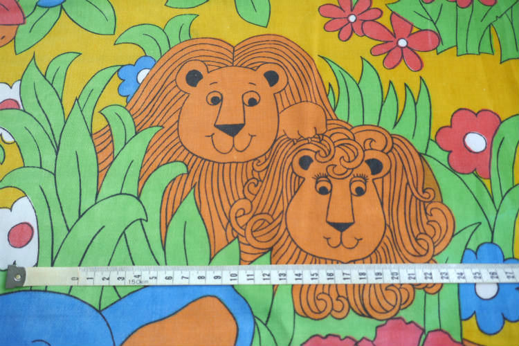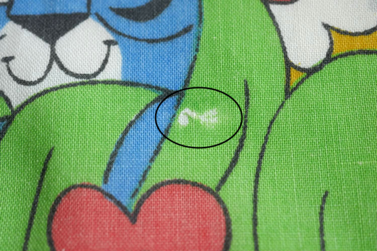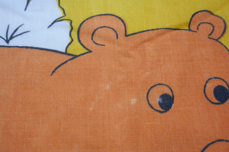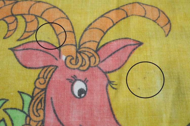 プリントの発色良く、生地もしっかりしておりますが、数カ所に薄いヨゴレ部分・数カ所に小さな穴がございます。