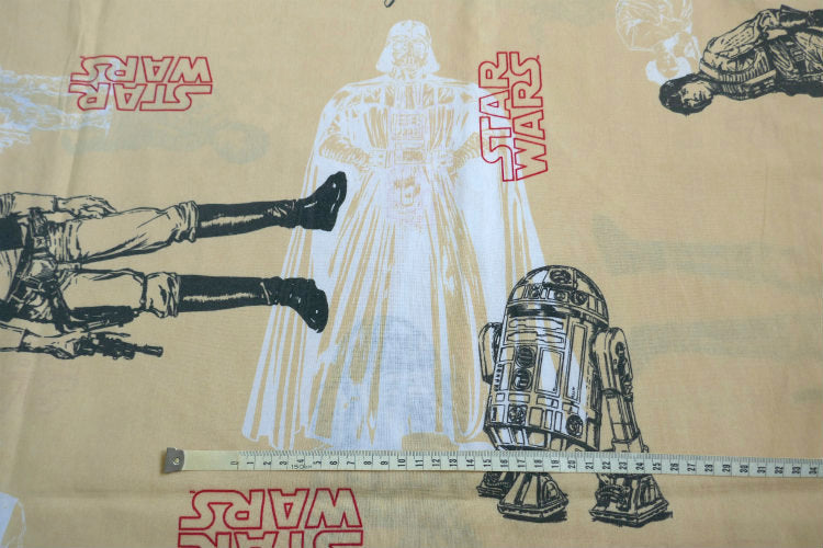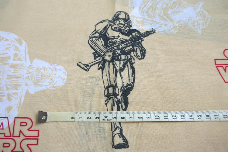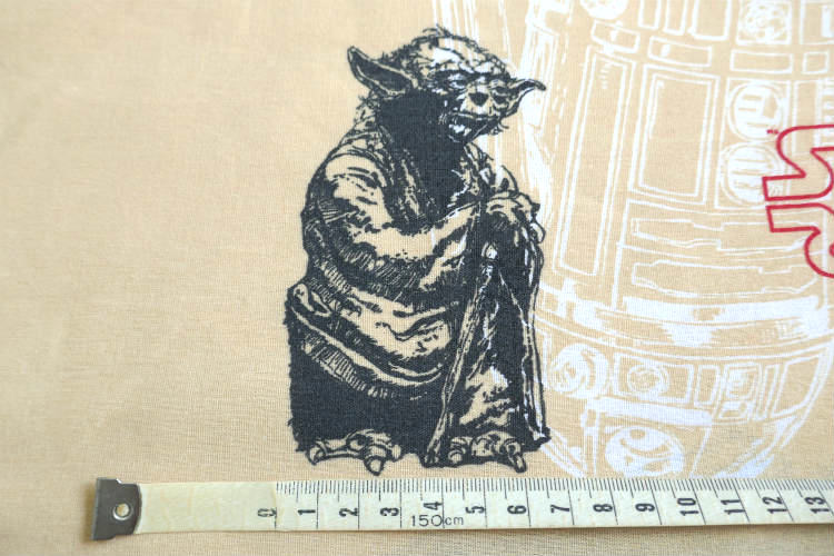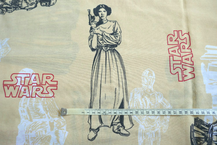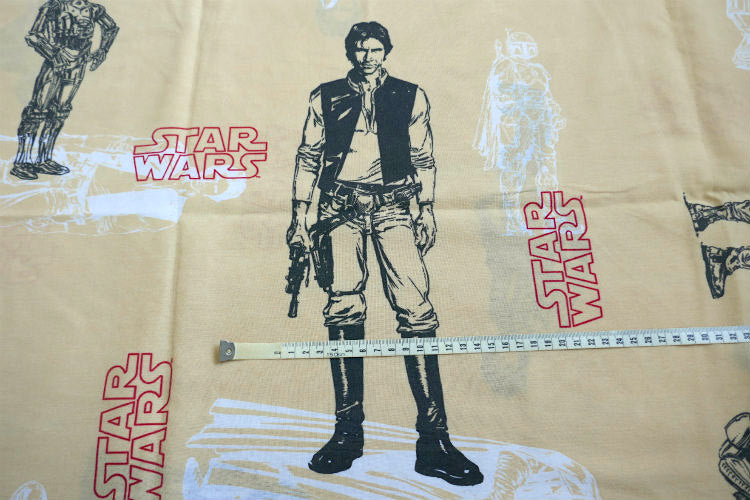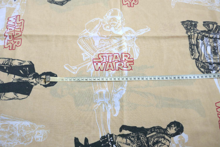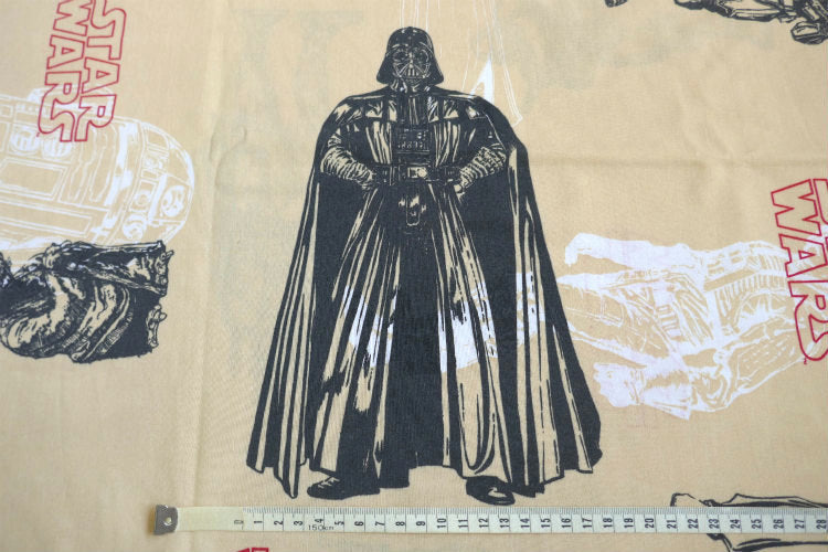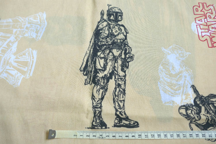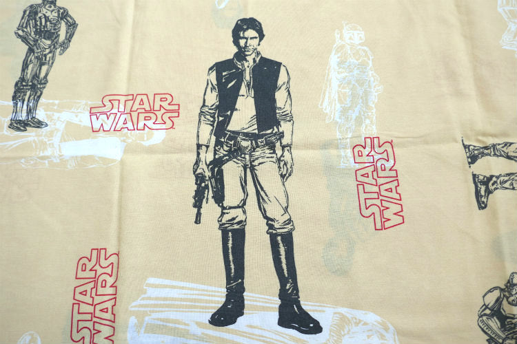 ベージュ柄ベースに、ハンソロやダースベイダー・ヨーダ・R2-D2・C-3PO・レイアオーガナ等の総柄プリントです。