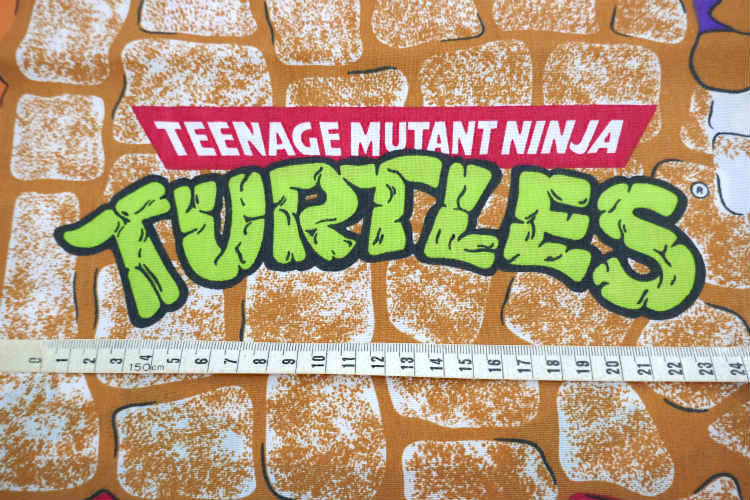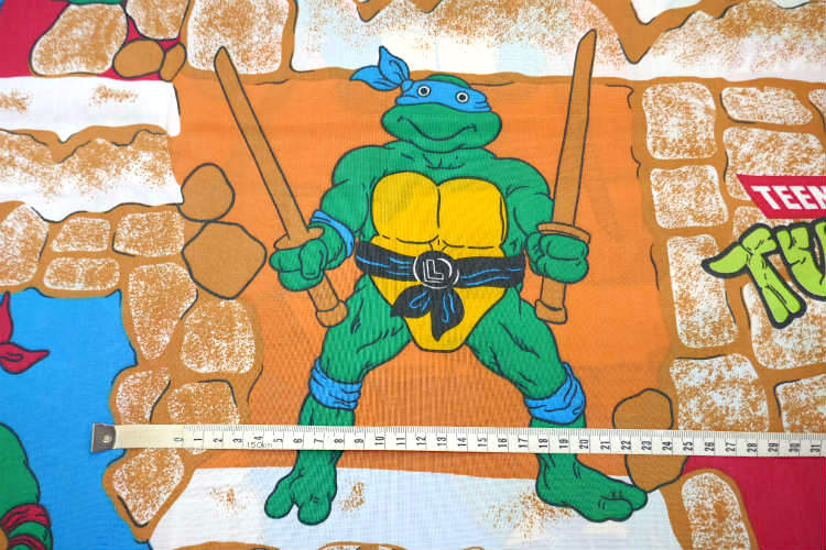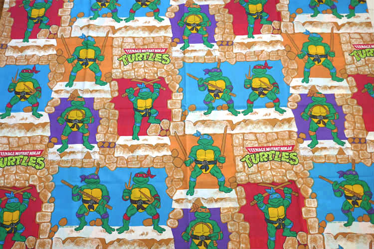 アメリカ西海岸・カリフォルニア州で見つけました・・4人組の亀の戦隊ヒーロー『ミュータント・タートルズ』のヴィンテージ・USEDフラットシーツです(ツインサイズ)。