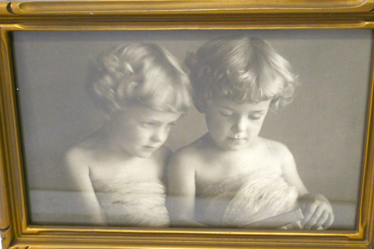 四つ角にラインのデザインが施されたゴールドトーンのゴージャスな木製フレーム内に、可愛い双子の証書のセピア写真が入っています。