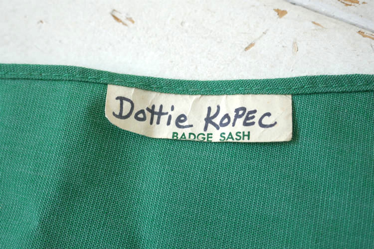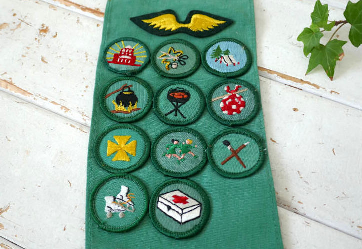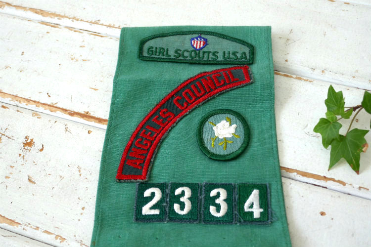 ″GIRL SCOUT USA″や″ANGELES COUNCIL″・″ホワイトローズ部隊″・ブラウニー(クラス)を終えた″ウィングス″・裁縫や火起こし・テント・タイマツ・救急・ローラースケートなど、たくさんのワッペン(19個)が付いています。