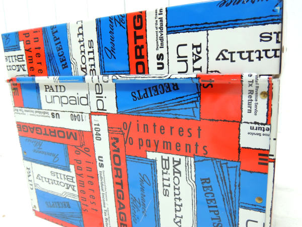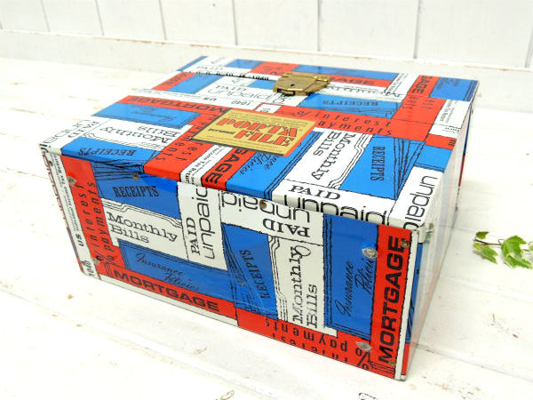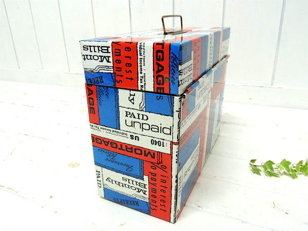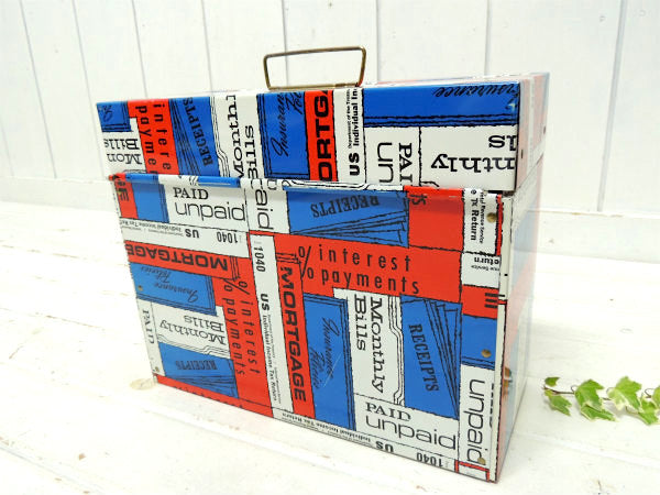 赤×青×白色ベースに、“RECEIPTS(レシート)”・“Insurance Policies(保険証券)”・“US Department of the Treasury/Internal Revenue Service Individual Income Tax Return(確定申告)”・“Monthly Bills(月払い)”・“Mortgage(担保)”など、保険や支払い・タックスリターンなどに関する言葉が全面にプリントされたカラフルな書類ケースです。