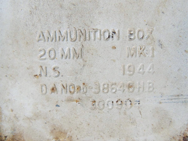 両面と蓋に【AMMUNITION BOX 20MM MK1 N.S. 1944 / DANO RD 3864GHB 300904】のエンボス文字が入っています。
