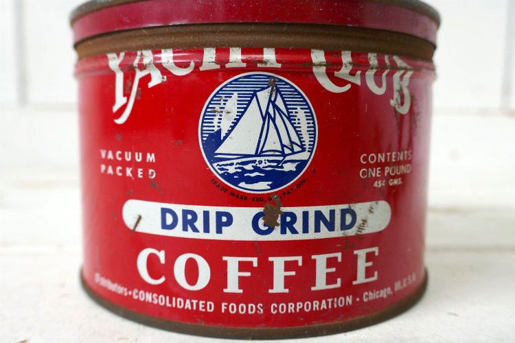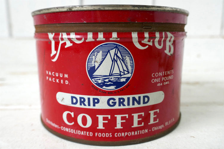 赤色ボディに、ヨットの絵柄&【YACHT CLUB COFFEE DRIP GRIND / Distributors・CONSOLIDATED FOODS CORPORATION・Chicago, Ill., U.S.A.】、サイドに【Rich AND Flavorful】、フタにパーコレーターのイラスト&【DRIP OR GLASS MAKER GRIND】など、たくさんの英文字が入った、カラフルなパッケージです。