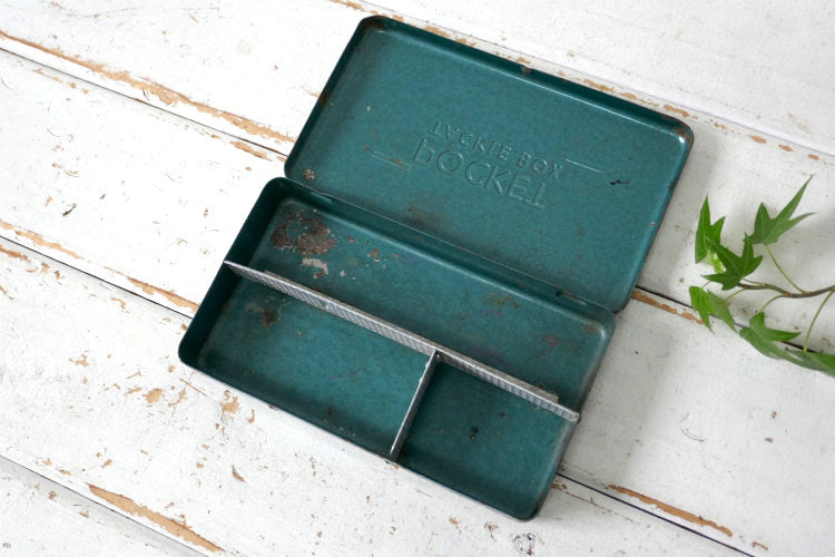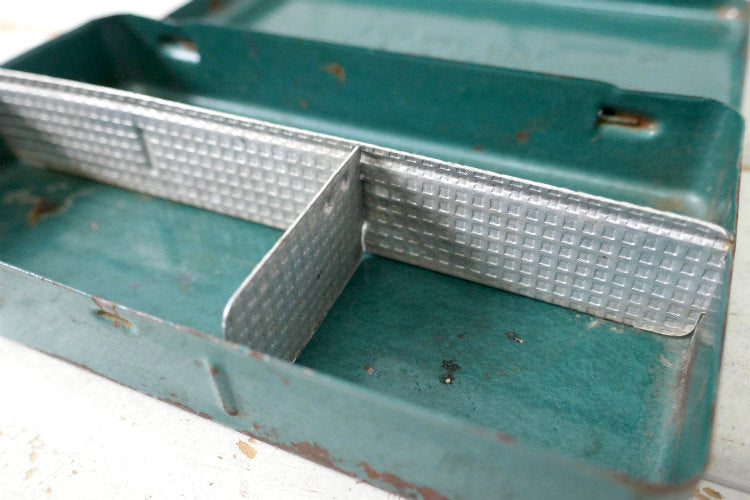 アメリカ西海岸 カリフォルニア州 ロサンゼルスで見つけました・・POKET TACKLE BOX(ポケット タックルボックス 仕切り付き) ヴィンテージ&オールド・タックルボックス・メタル製です。
