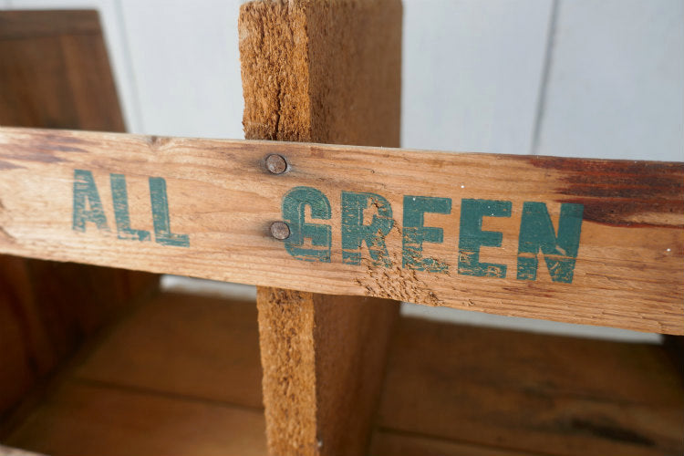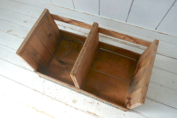 農場でアスパラガスを入れて運んでいた、仕切り付きのベジタブル木箱です。