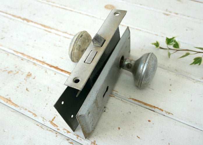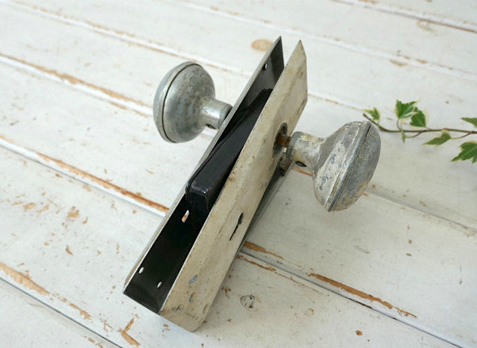 メタル製の丸いドアノブ2個(表裏)・アイアン製ラッチケース・角座2枚(長方形の台座)、全5点のドアノブセットです。