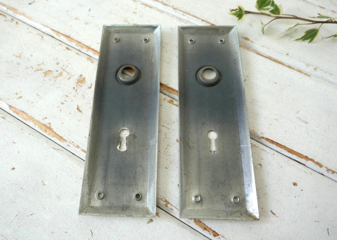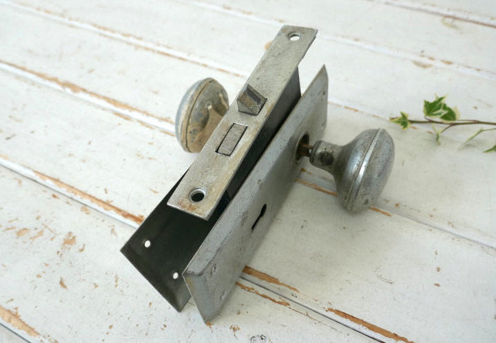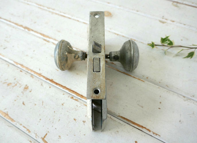 メタル製の丸いドアノブ2個(表裏)・アイアン製ラッチケース・角座2枚(長方形の台座)、全5点のドアノブセットです。