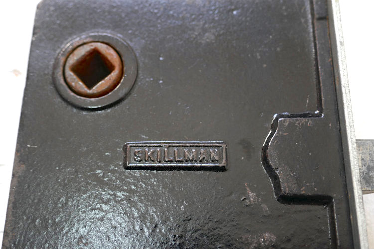 アメリカ西海岸・カリフォルニア州・サンフランシスコで見つけました・・『Skillman』のメタル製・角座&ラッチ付き・アンティーク・ドアノブセットです。