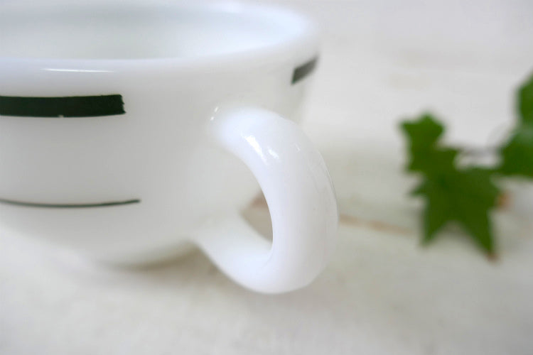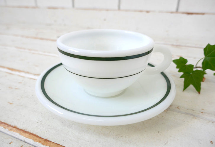 アメリカ西海岸・カリフォルニア州・サンフランシスコで見つけました・・『CORNING社(コーニング)』のミルクガラス製・グリーンライン・ヴィンテージ・カップ&ソーサーです。