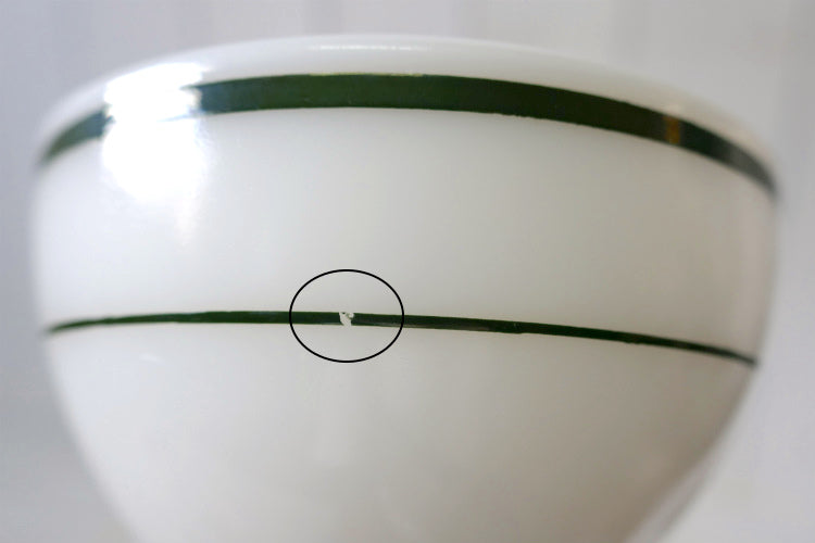白色ミルクガラスの温かみあるボディに、深緑色のラインが入っており、ミッドセンチュリー時代のモダンなデザインです。