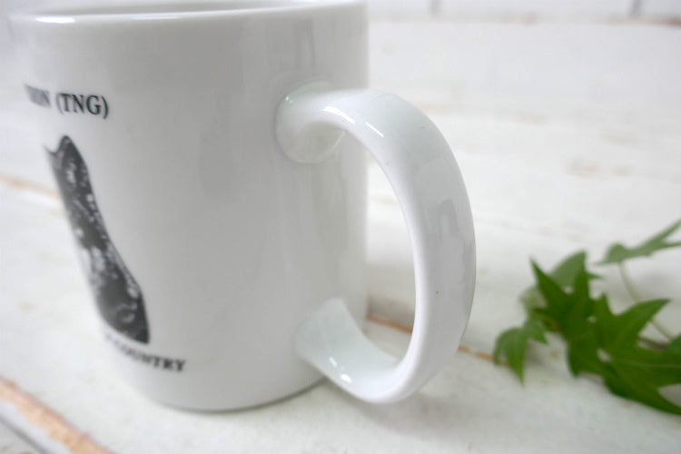 ホワイトベースのセラミック製マグカップの表面に、ティンバーウルフの絵柄&【104th DIVISION(TNG) TIMBERWOLF COUNTRY】の文字、背面にカリフォルニア州とオレゴン州の州地図&【WASHINGTON, OREGON & CALIFORNIA】の文字プリントが入っています。