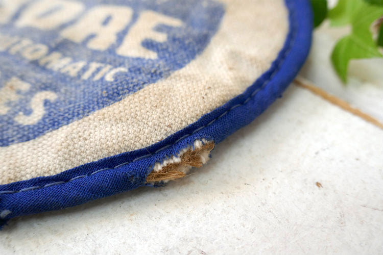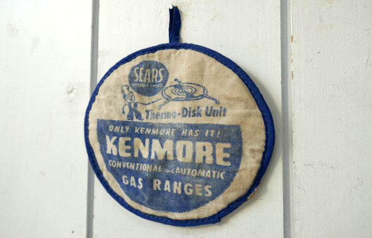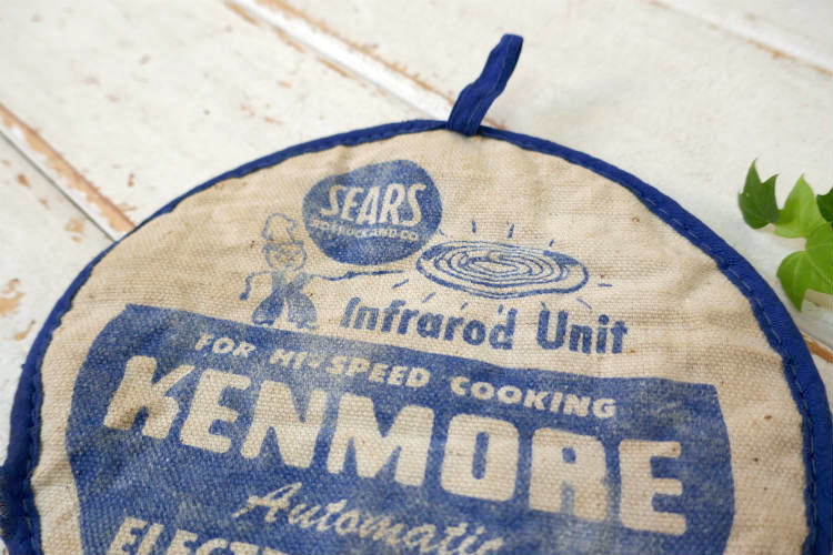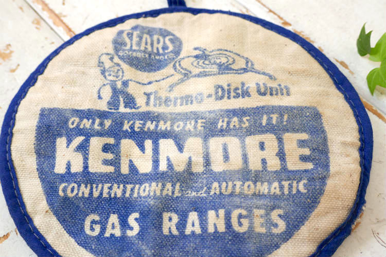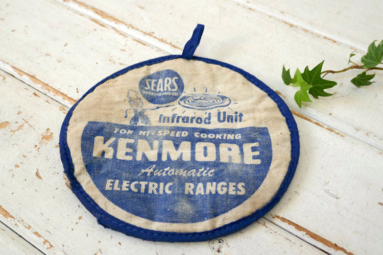 ブルーのパイピングが施された丸い鍋敷きの両面に、コックさんがヒーターを指しているイラスト&【SEARS ROEBUCK AND CO. Infrarod Unit FOR HI-SPEED COOKING KENMORE Automatic ELECTRIC RANGES】【SEARS ROEBUCK AND CO. Thermo-Disk Unite ONLY KENMORE HAS IT! KENMORE CONVENTIONAL and AUTOMATIC GAS RANGES】の文字がプリントされた、ポップなデザインです。