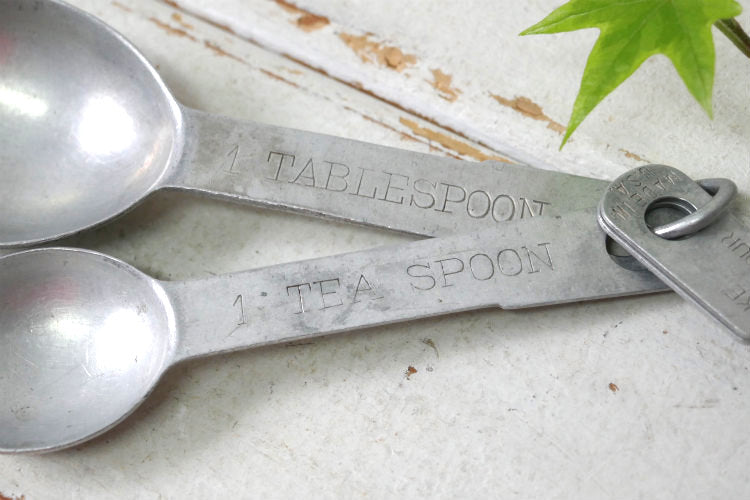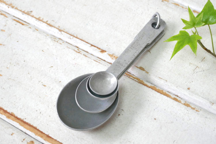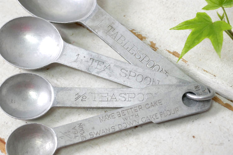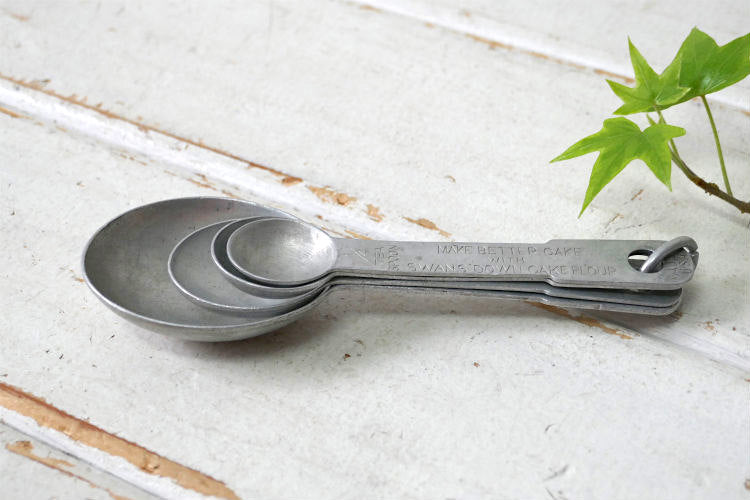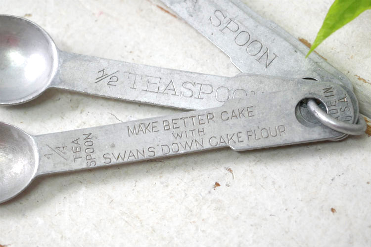 スプーンの持ち手に【1 TABLESPOON】・【1 TEASPOON】・【1/2 TEASPOON】・【1/4 TEASPOON / MAKE BETTER CAKE SWANS DOWN CAKE FLOUR MADE IN U.S.A.】と刻印が入っています。