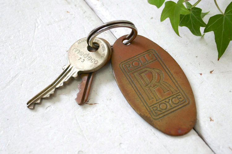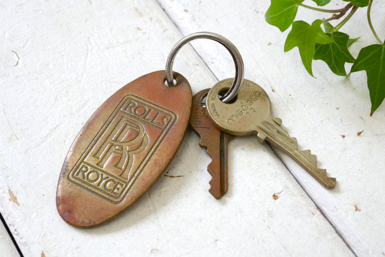 アメリカ西海岸・カリフォルニア・サンフランシスコで見つけました・・『Rolls Royce(ロールス・ロイス)』の真鍮製・ヴィンテージ・キーホルダー オーナーズキーリング&古鍵2本付きです。