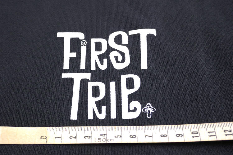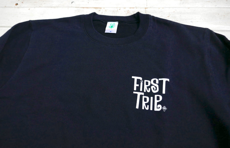 ネイビーボディのフロント左胸に【FIRST TRIP】のロゴプリント(W8×H7㎝)が入っています。